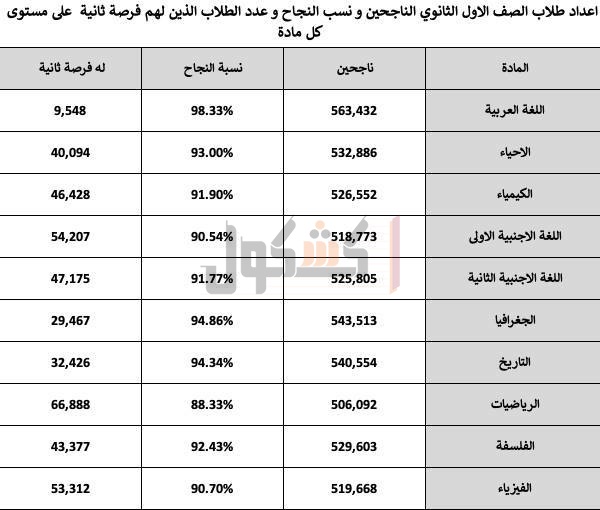 الدقيقة والنهائية للناجحين في كل مادة ومن يجب عليهم دخول الدور الثاني وكذلك نسبة