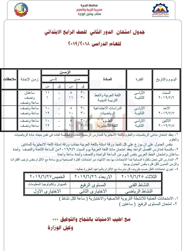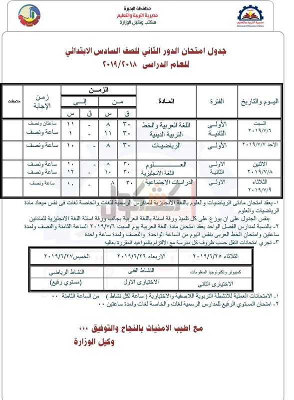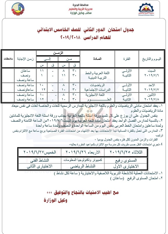 مديرية التربية والتعليم بالبحيرة، جدول امتحان الدور الثاني للصفوف الدراسية من الرابع
