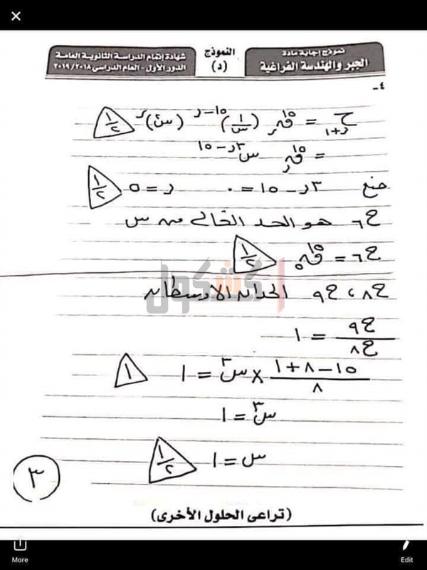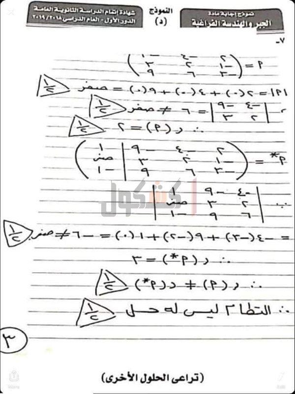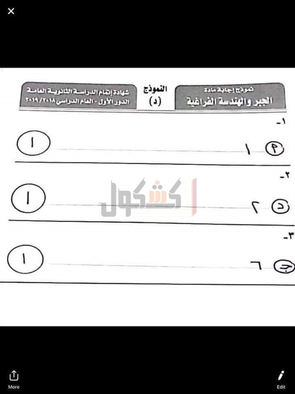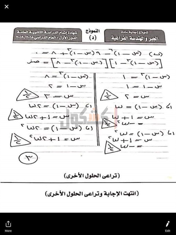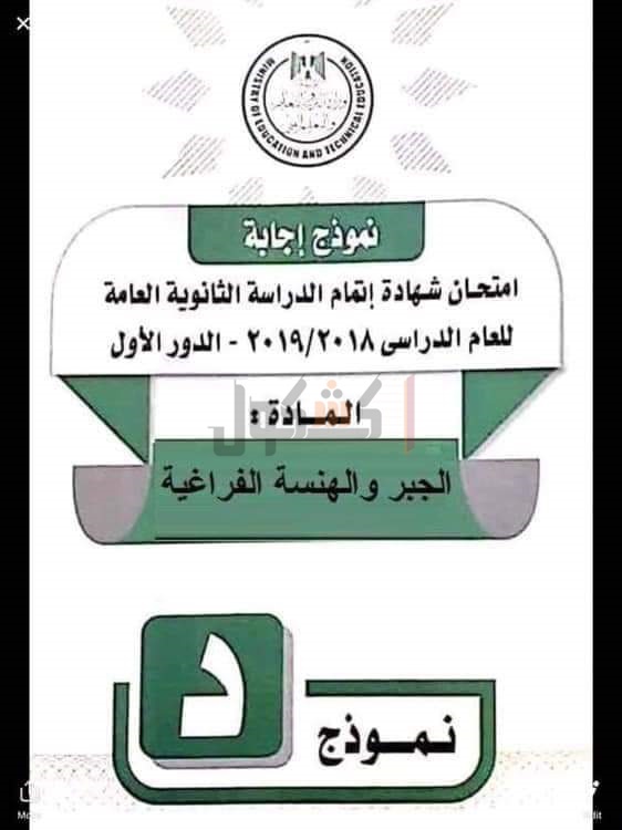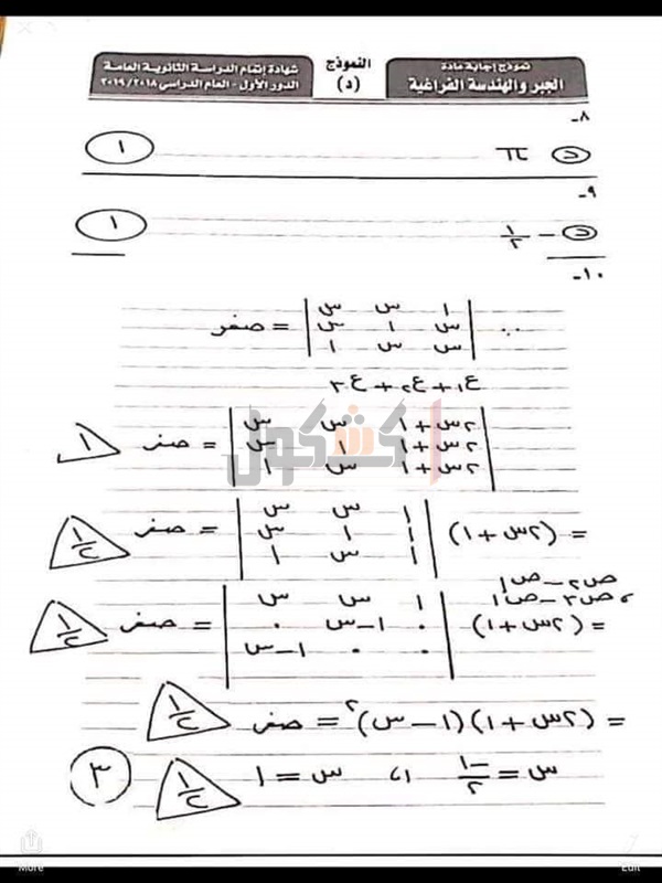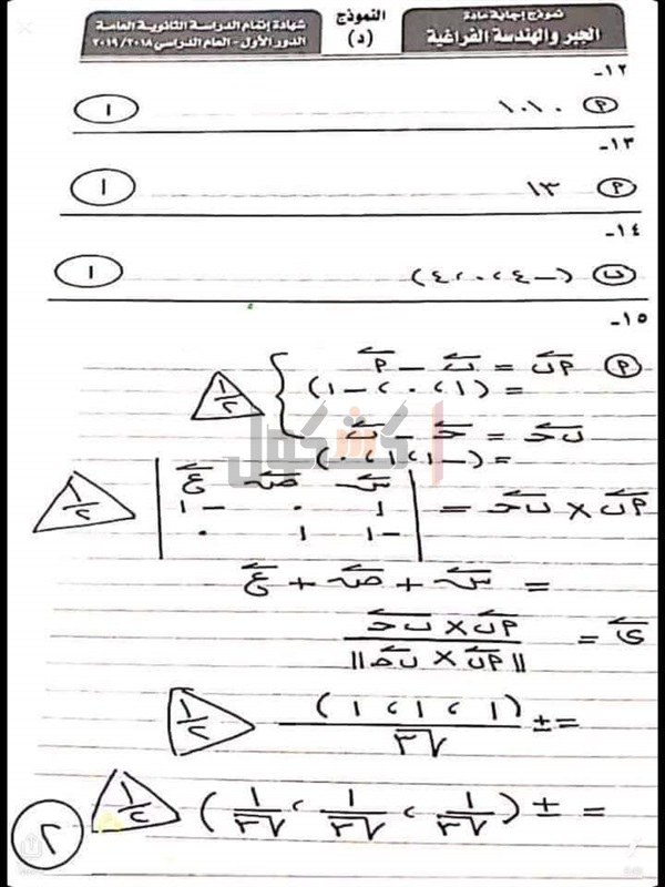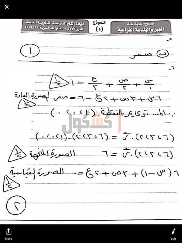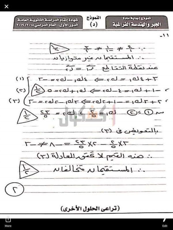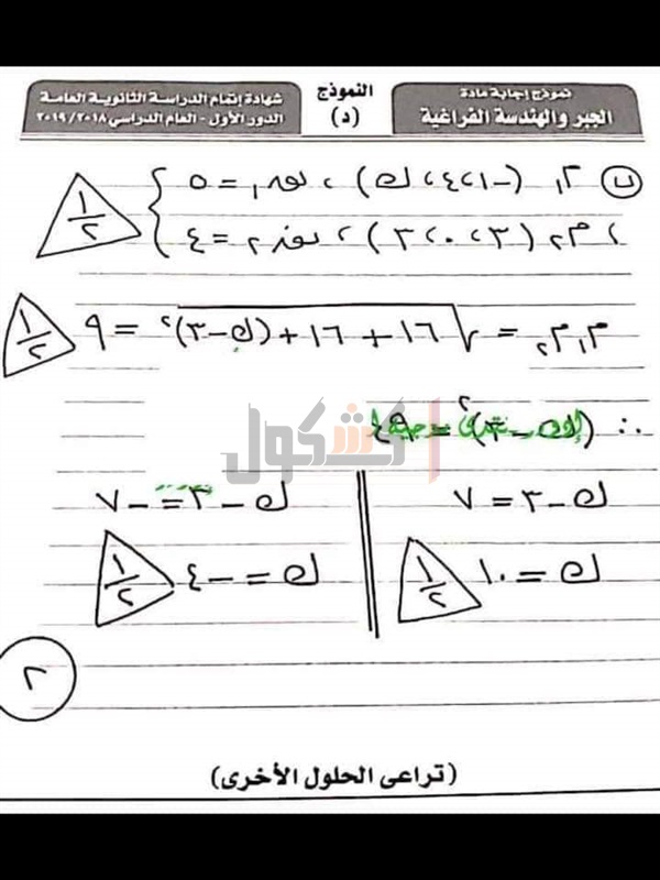 نموذج إجابة امتحان الجبر والهندسة الفرغية للثانوية العامة 2019
