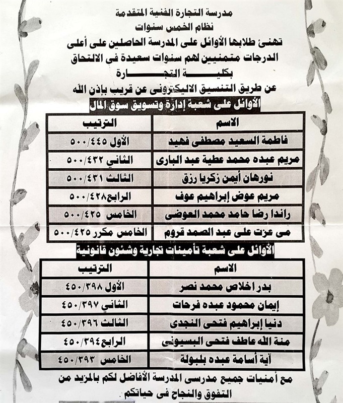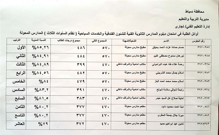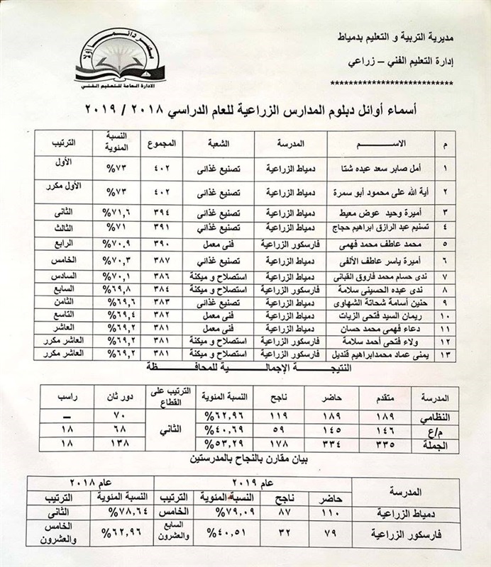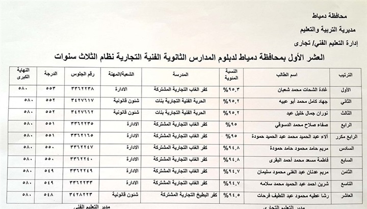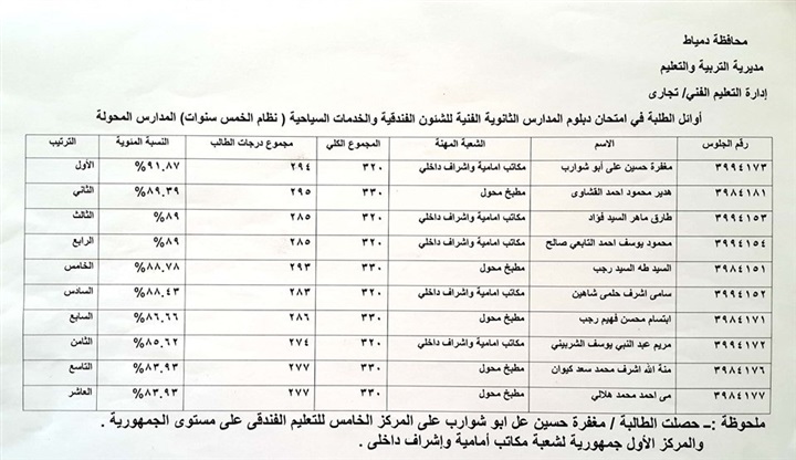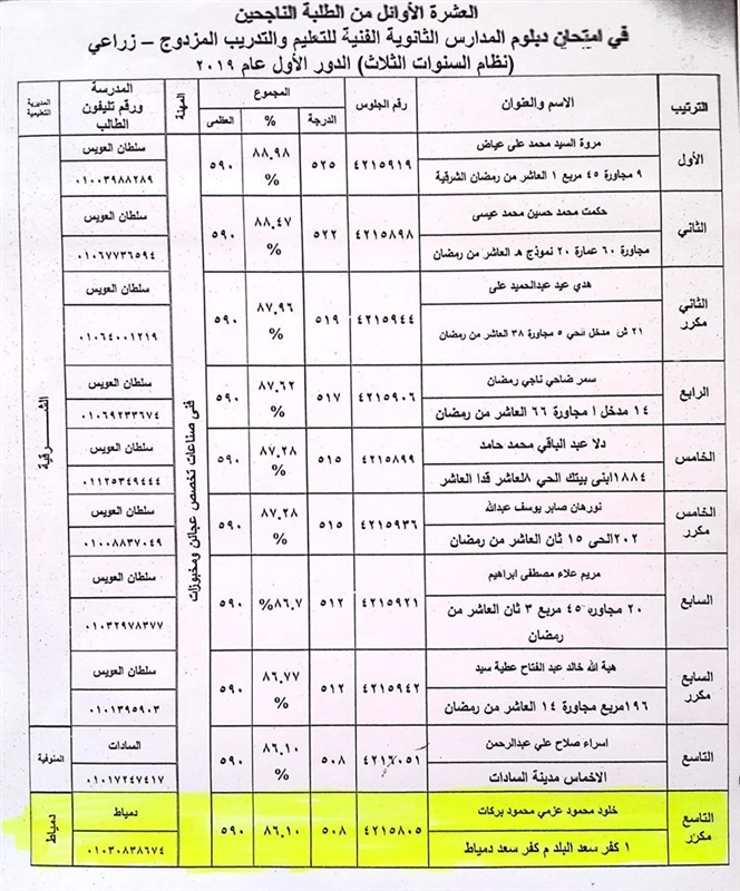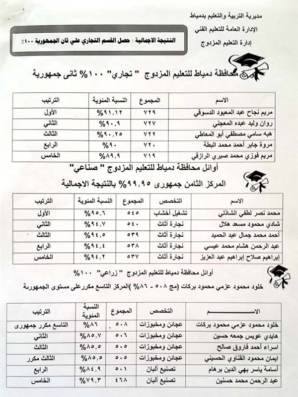 بالأسماء.. تعليم دمياط تنشر أوائل المحافظة للتعليم الفني