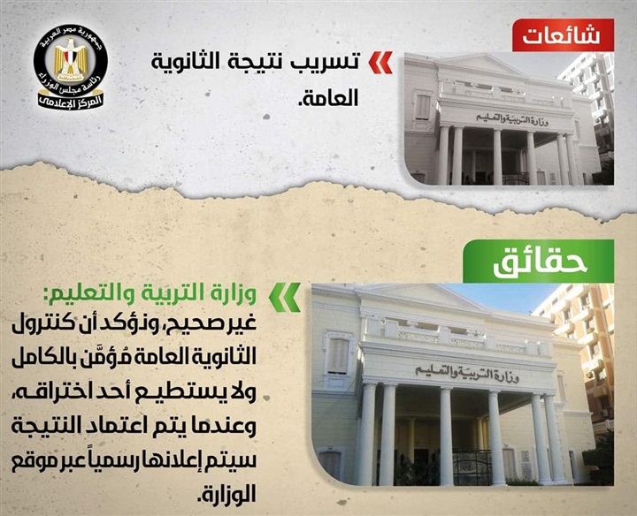 الاخبار المتداولة غير صحيحة، وأكدت أن كنترول الثانوية العامة مؤمن بالكامل، ولا