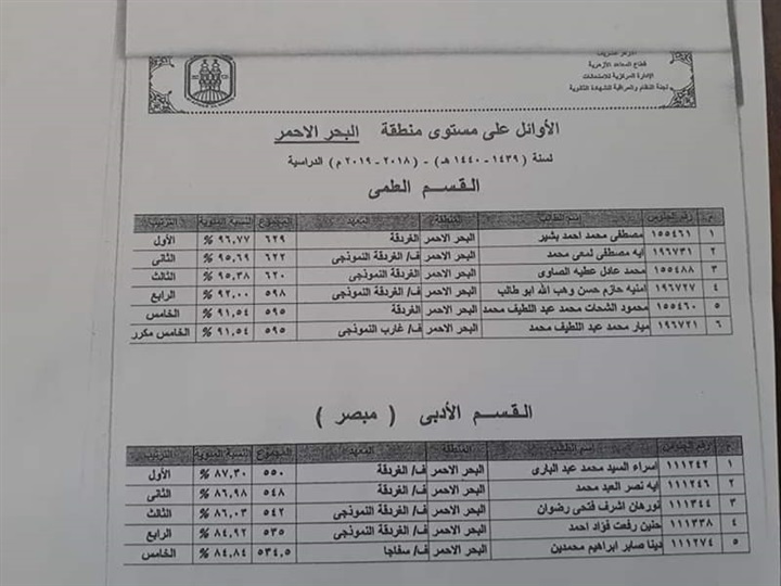 "الغردقة"تحتل المراكز الأولى في قائمة الثانوية الأزهرية بالبحر الأحمر
