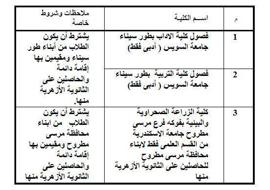 - فصول كلية التربية بطور سيناء جامعة السويس لطلاب القسم الأدبى، شرط أن يكون من أبناء سيناء.