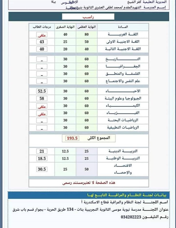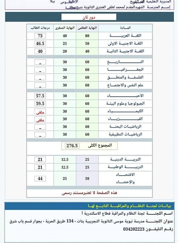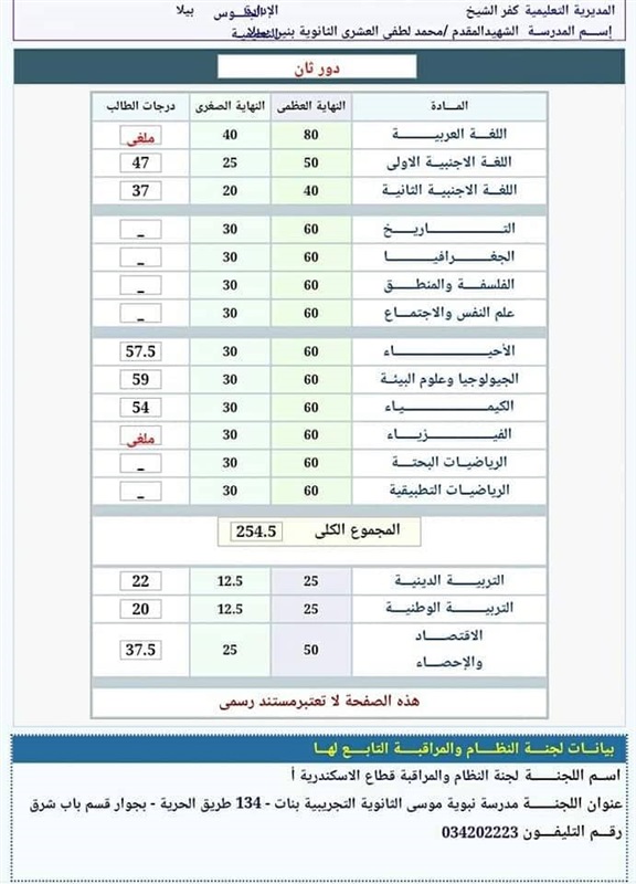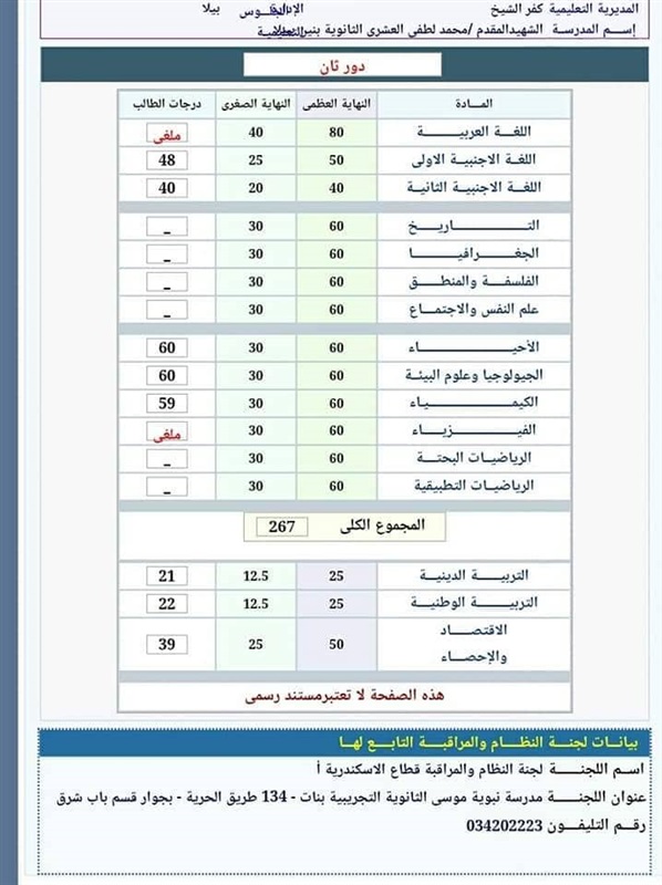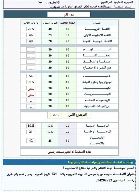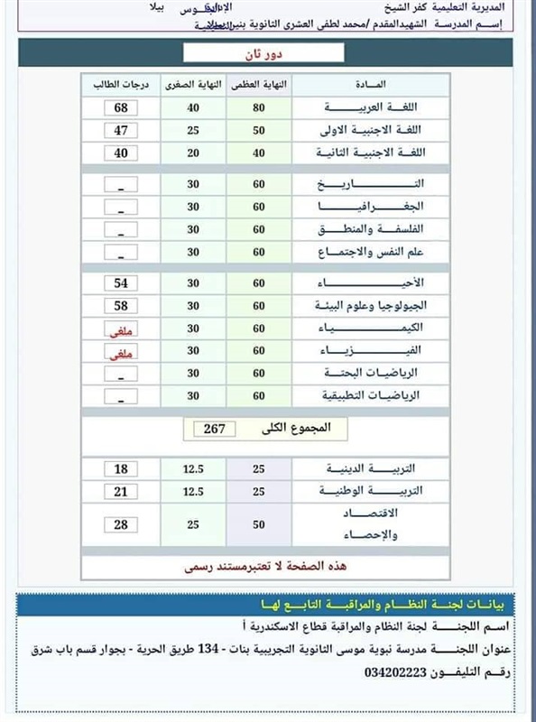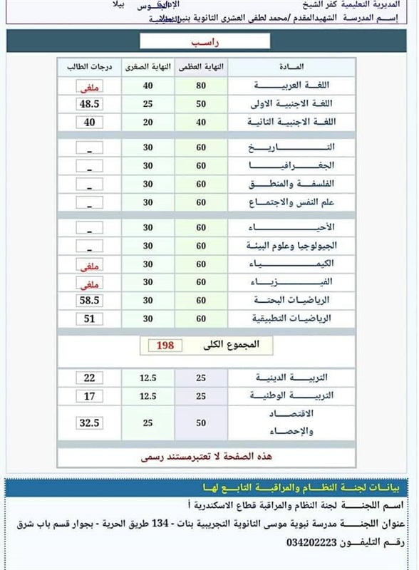 نشر رواد مواقع التواصل الاجتماعي صور لنتائج طلاب لجنة مدرسة الشهيد محمد لطفي العشري ببيلا المعروفة باسم لجنة أولاد الأكابر.