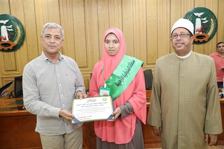 وقدم المحافظ شهادات تقدير لرئيس الإدارة المركزية ومديرى إدارات بركة السبع وأشمون وقويسنا وعدد من مديرى المعاهد الأزهرية ، كما تم تسليم شهادات تقدير ومبالغ مالية لأوائل الثانوية الأزهرية تقديراً لتفوقهم وتميزهم العلمي وهم ، الطالبة إسراء أحمد فتح الله الحاصلة على المركز الثانس بمعهد فتيات ميت بره، الطالبة رفيدة عبدالمنعم خليل الحاصلة على المركز الثالث بمعهد فتيات دلهمو للشعبة الأدبية على مستوى الجمهورية ،كما حصت الطالبة مريم حسن عبدالعزيز الحاصلة على المركز الرابع بمعهد فتيات أشمون ، الطالبة الشيماء إبراهيم شعبان الحاصلة على المركز السابع بمعهد فتيات هورين للشعبة العلمية على مستوى الجمهورية.