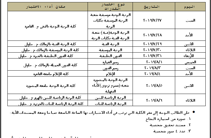 وتيسيرا على الطلاب وأولياء الأمور تقرر الاستمرار في إتاحة الفرصة أمام هؤلاء الطلاب لتسجيل اختبارات القدرات الكترونياً عن طريق موقع التنسيق الإلكتروني على شبكة الإنترنت هنا، وذلك برقم الدخول والرقم السري الذي يتسلمه الطالب من مكتب التنسيق عند صرف أوراق ودليل القبول وسيتم فتح الموقع والتسجيل لحجز هذه الاختبارات اعتباراً من غدٍ الأربعاء، ويتم إجراء هذه الاختبارات في الأماكن والمواعيد المحددة على النحو التالي :