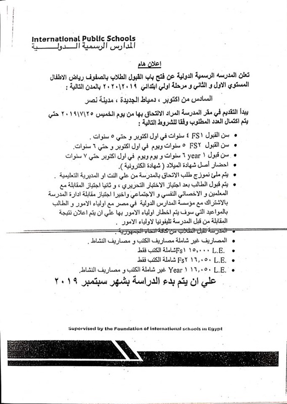 وأوضحت إدارة المدارس الرسمية في بيانها أن التقديم يبدأ في مقر المدارس المراد الالتحاق بها بداية من غدا الخميس 25 يوليو 2019، وحتى إكتمال العدد المطلوب وفق الشروط التالية.