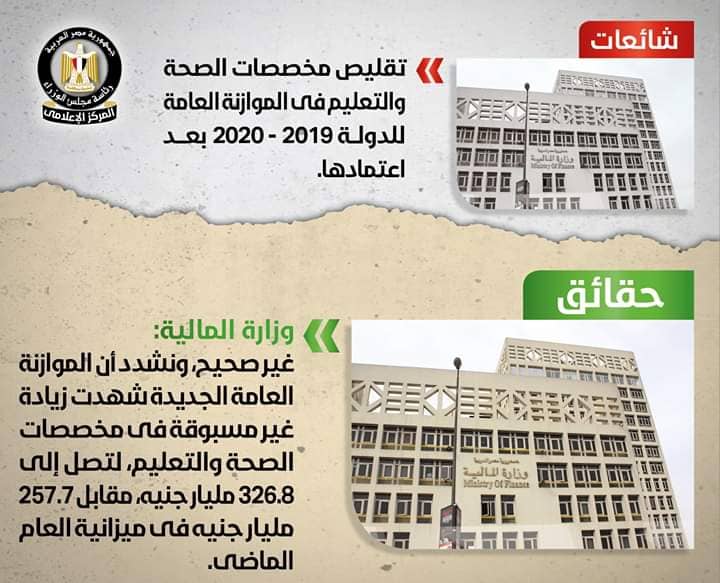 نفى مجلس الوزراء ما تردد من شائعات حول تقليص مخصصات الصحة والتعليم في الموازنة العامة للدولة 2019/2020 بعد اعتمادها.