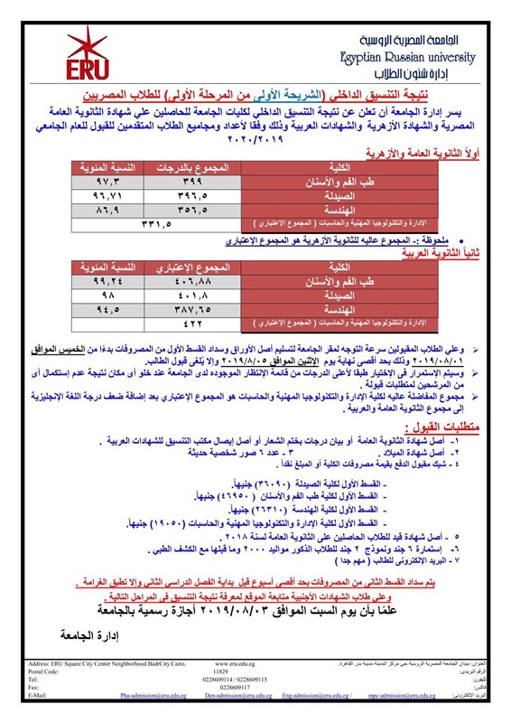 تنسيق الجامعات 2019.. نتيجة المرحلة الأولى لـ"الروسية المصرية"