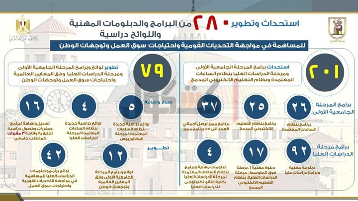 وقال رئيس جامعة القاهرة، إن الجامعة قامت باستحداث وتطوير 280 لائحة وبرنامج دراسي بمرحلتي البكالوريوس والليسانس والدراسات العليا والتعليم المدمج توافق المعايير الدولية في التعليم، حيث تم تطوير عدد من اللوائح الدراسية، وطرح 26 برنامج بنظام الساعات المعتمدة في مرحلة البكالوريوس والليسانس بالكليات، و25 برنامج بنظام التعليم الإلكتروني المدمج الذي تقدمه الكليات من خلال مركز الجامعة للتعليم المدمج.