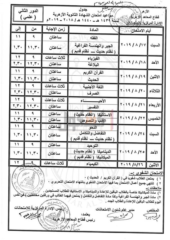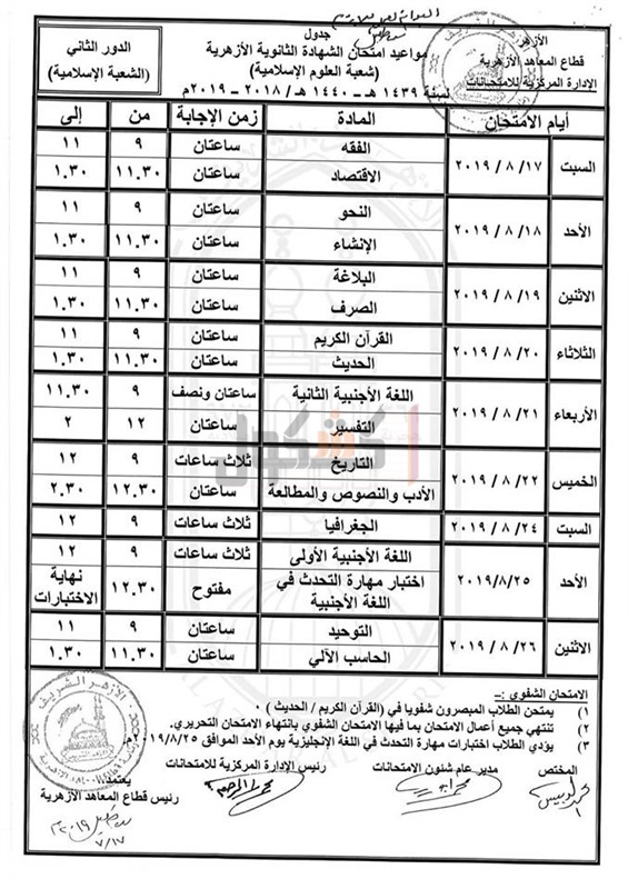 وينشر كشكول جدول امتحانات الدور الثاني للشهادة الثانوية الأزهرية.