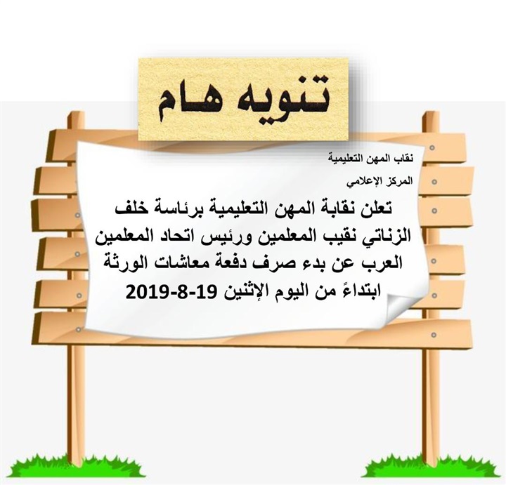 أعلنت نقابة المهن التعليمية برئاسة خلف الزناتي نقيب المعلمين ورئيس اتحاد المعلمين العرب، عن بدء صرف دفعة معاشات الورثة ابتداءً من اليوم الاثنين 19 من أغسطس الجاري.