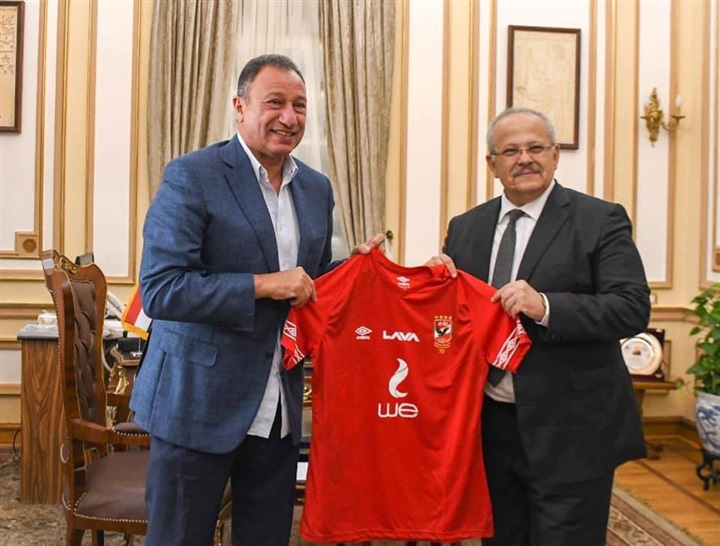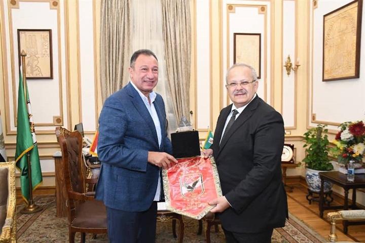 تبادل الدكتور محمد عثمان الخشت رئيس جامعة القاهرة، والكابتن محمود الخطيب رئيس مجلس إدارة النادي الأهلي، خلال توقيع بروتوكول التعاون اليوم، عدد من الهدايا والدروع وتيشيرت القلعة الحمراء، وذلك بحضور اللاعب خالد بيبو مدير الأكاديميات، والعميد محمد مرجان المدير التنفيذي للنادي الأهلي.