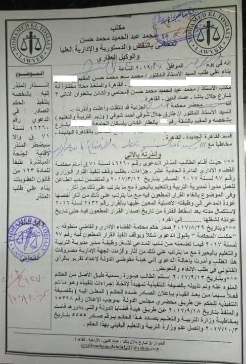 وذكر بالإنذار أنه بتاريخ 29 أغسطس 2017 صدر حكم محكمة القضاء الإداري بمجلس الدولة في الدعوى رقم 46260 لسنة 71 قضائية بوقف تنفيذ القرار رقم 97 لسنة 2017 فيما تضمنه من ندب "محمد سعد" رئيس الإدارة المركزية للتعليم الثانوي بوزارة التعليم لشغل وظيفة مدير مديرية التربية والتعليم بالبحيرة مع ما يترتب على ذلك من آثار.