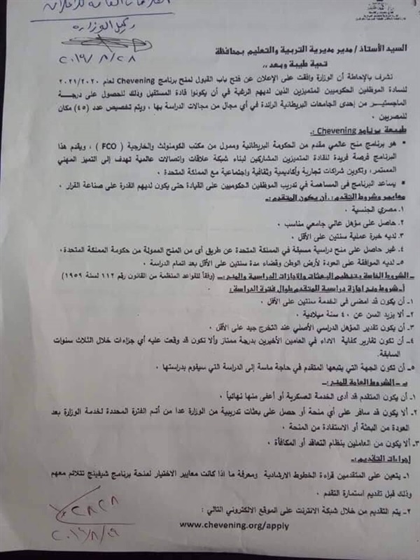 أعلنت وزارة التربية والتعليم عن فتح باب التقدم لمنح chevening البريطانية، المتعلقة بقادة المستقبل .