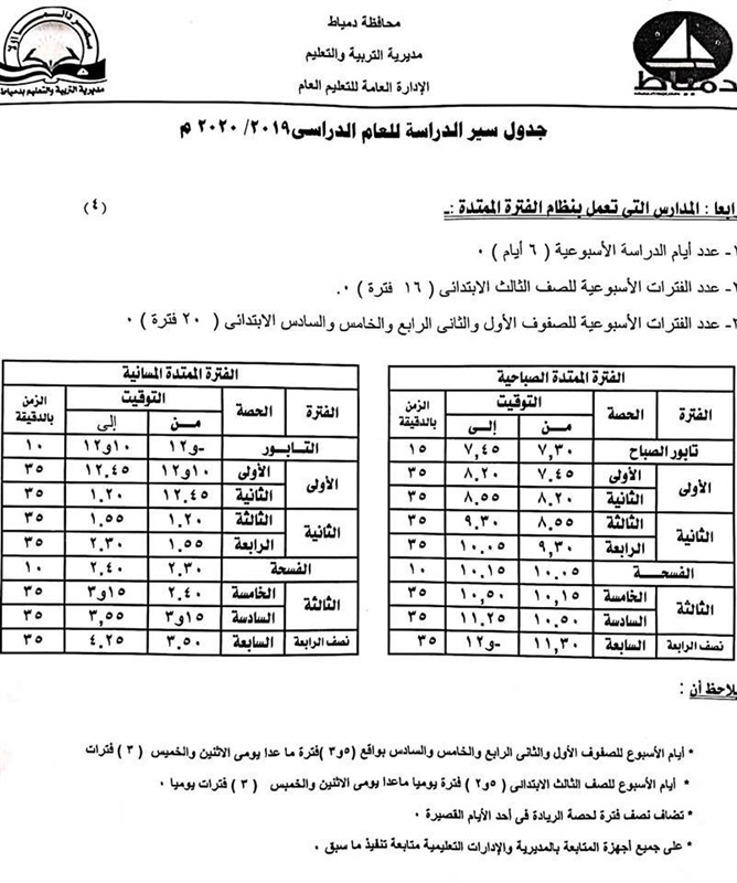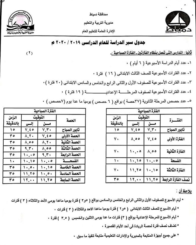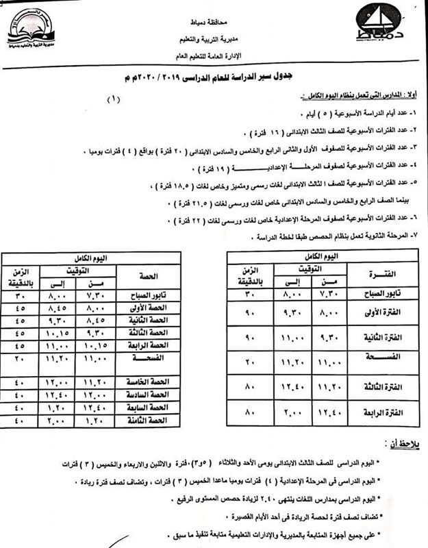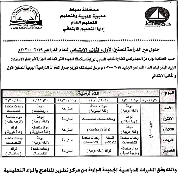 أعلنت مديرية التربية والتعليم والتعليم الفني بدمياط جدول سير الدراسة بجميع الصفوف الدراسية وفق الخطاب الوارد من رئيس قطاع التعليم العام الدكتور رضا حجازي.