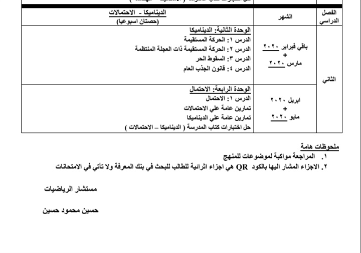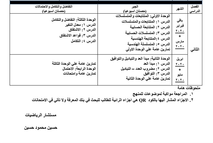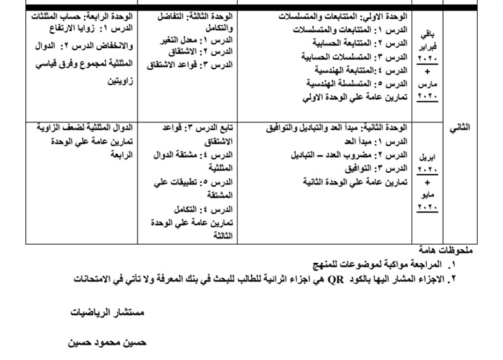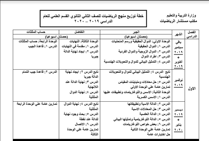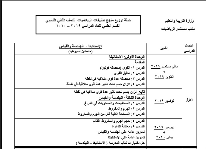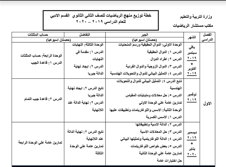 اعتمد مستشار مادة الرياضيات حسين محمود حسين خطة توزيع منهج الرياضيات للمرحلة الثانوية العام الدراسي 2019/2020.