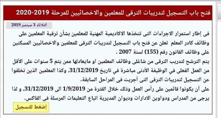 وأوضحت، الأكاديمية، أنه يتم الترشح لتدريب الترقي من شاغلي وظائف المعلمين وما يعادلها ممن يتم 5 سنوات علي الأقل من العمل الفعلي في الوظيفة الأدني مباشرة في تاريخ 31/12/2019 وكذا المعلمين الذين تخلفوا عن التسجيل في تدريبات الترقي التي اجريت في المراحل السابقة.