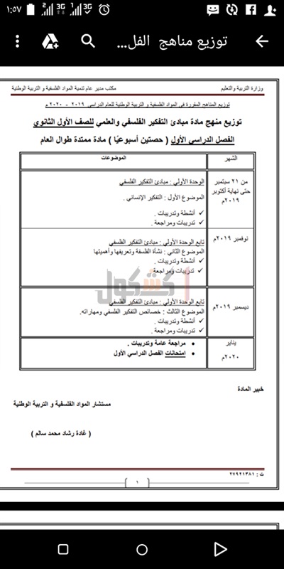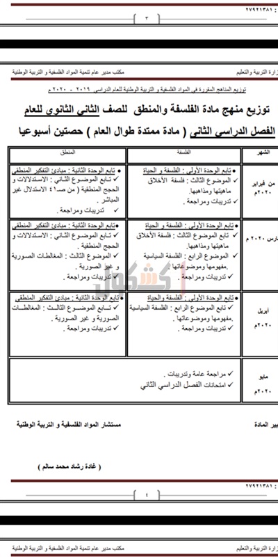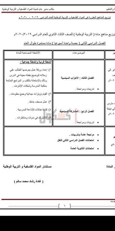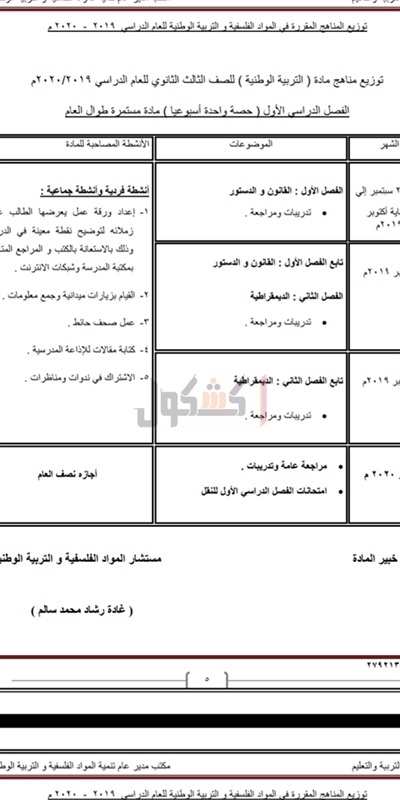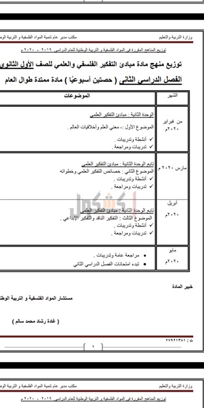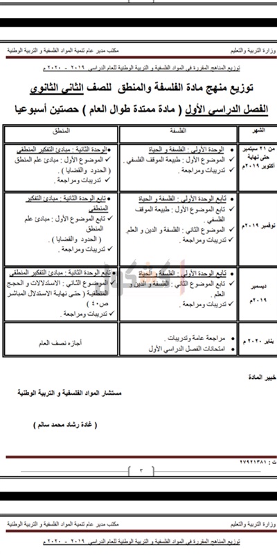 اعتمدت غادة رشاد محمد سالم، مستشار مادة الفلسفة والتربية الوطنية بوزارة التربية والتعليم، توزيع منهج الفلسفة والتربية الوطنية للمرحلة الثانوية استعداداً لبدء الدراسة العام الجديد 2019/2020.