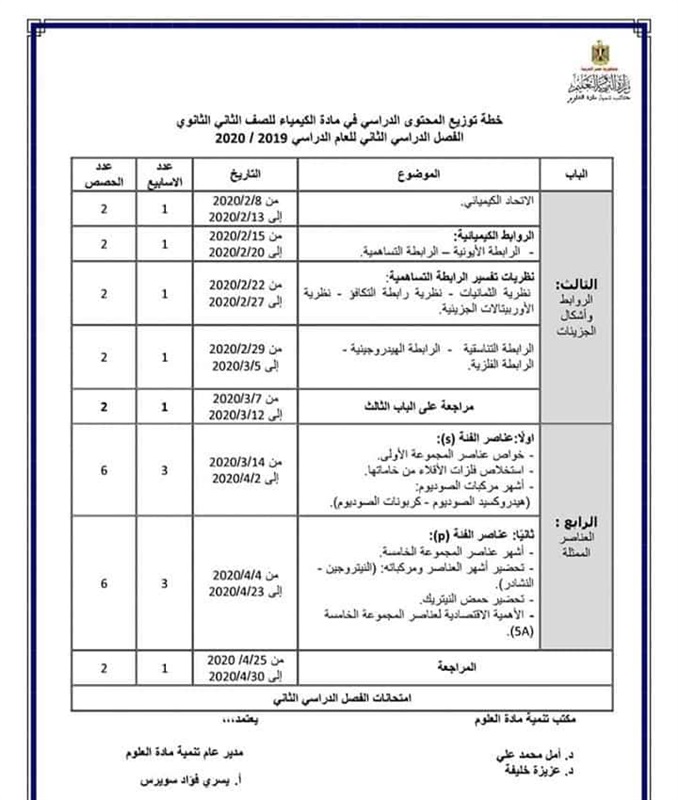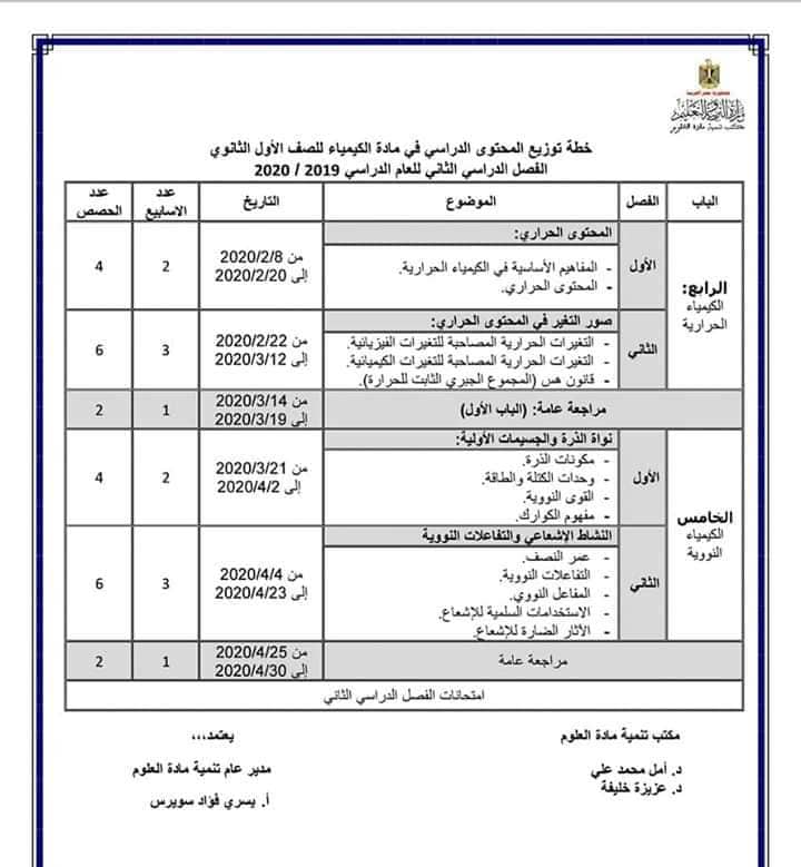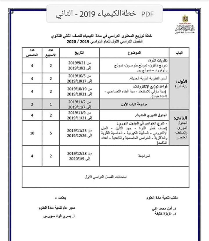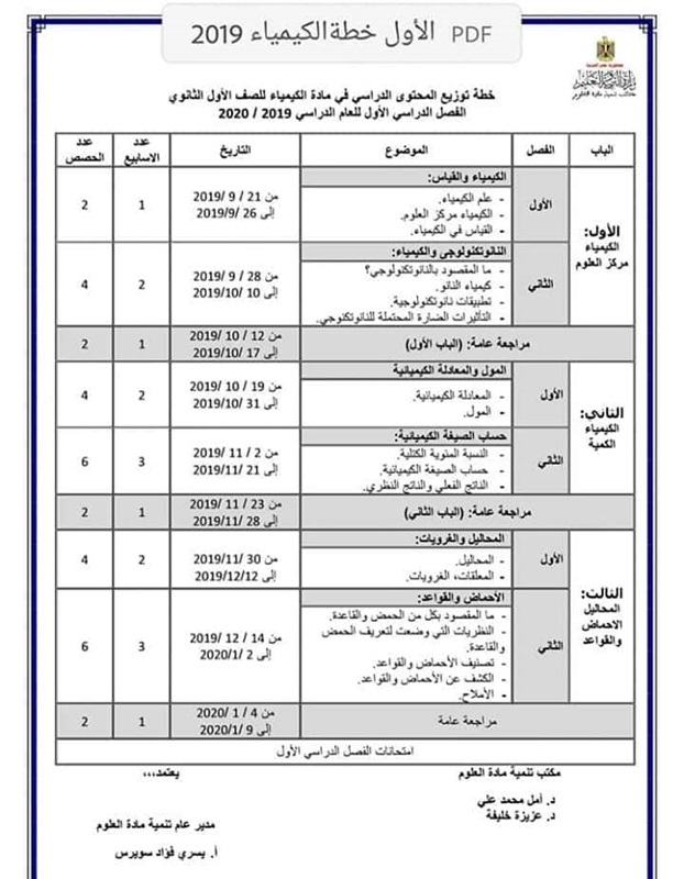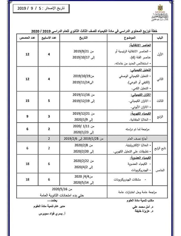 توزيع منهج الكيمياء للمرحلة الثانوية 2019/2020