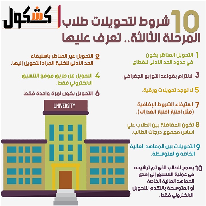 جراف انفوجراف.. 10 شروط لتحويل طلاب المرحلة الثالثة لتنسيق الجامعات محمود عبدالجواد الأحد 08/سبتمبر/2019 - 03:10 م 9/8/2019 3:10:00 PM طباعة facebook twitter whats شارك