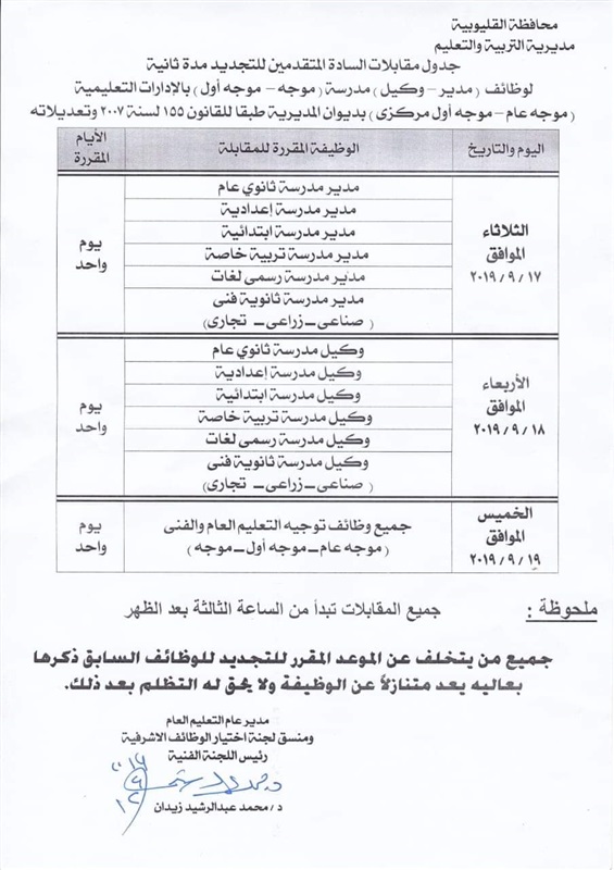 تعليم القليوبية تعلن موعد مقابلات التجديد لبعض الوظائف