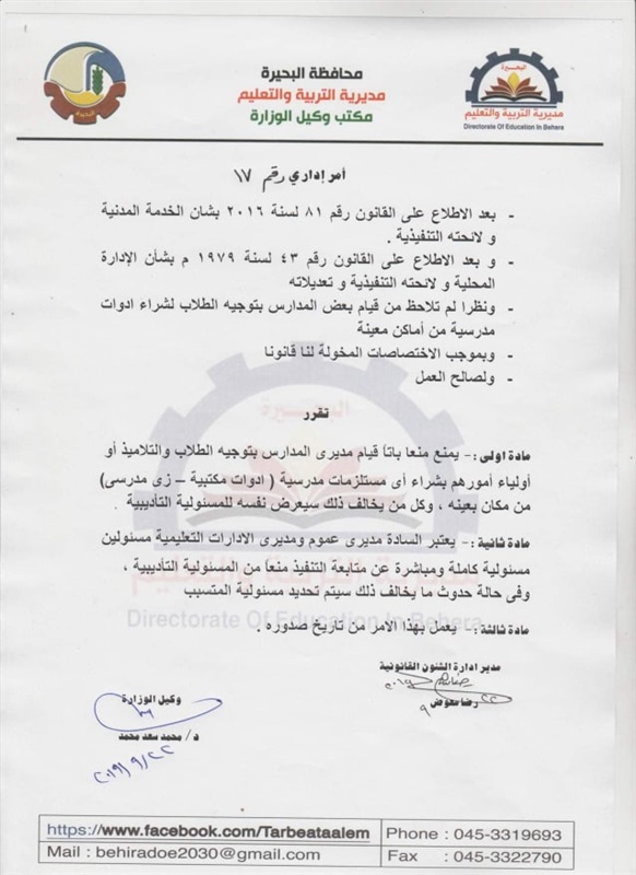 أصدرت مديرية التربية والتعليم بالبحيرة، أمر إداري رقم (17) لجميع الإدارات التعليمية التابعة للمحافظة، يتضمن الآتي: