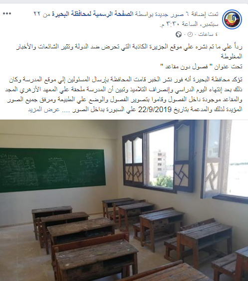 وأكدت المحافظة في بيان لها على الصفحة الرسمية بـ"الفيس بوك"، أنه فور نشر الخبر قامت المحافظة بإرسال المسئولين إلي موقع المدرسة وكان ذلك بعد إنتهاء اليوم الدراسي وإنصراف التلاميذ وتبين أن المدرسة ملحقة علي المعهد الأزهري المجد والمقاعد موجودة داخل الفصول وقاموا بتصوير الفصول والوضع علي الطبيعة.