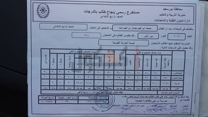 بنجله، وأنه منقول من الصف الرابع إلى الخامس الابتدائي دور ثانٍ، إن مدير المدرسة