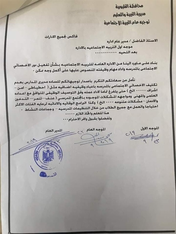 وجهت مديرية التربية والتعليم والتعليم الفني بالقليوبية فاكس لجميع الادارات التابعة لها حول تفعيل دور الأخصائي الاجتماعي بالمدرسة وإدارة مهام وظيفته علي أكمل وجه.