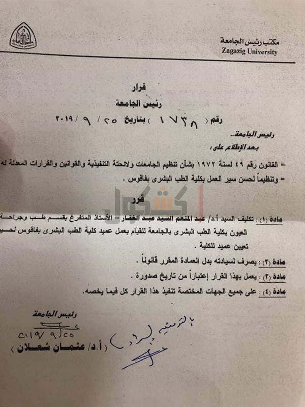أصدر الدكتور عثمان شعلان رئيس جامعة الزقازيق القرار رقم ١٧٣٨ بتاريخ ٢٥ سبتمبر الجاري بتكليف الدكتور عبدالمنعم أبو شرخ الأستاذ المتفرع بقسم طب الجراحة العيون بكلية الطب البشري للقيام بعمل عميد لكلية الطب البشري بفاقوس لحين تعيين عميدا للكلية.