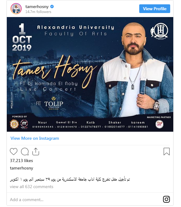 أعلن الفنان تامر حسني، عن تأجيل موعد حفله الغنائي، الذي من المقرر أن يحييه بكلية الآداب، بجامعة الإسكندرية.