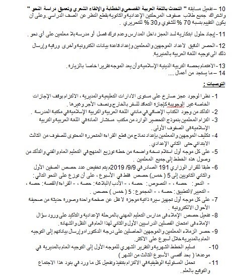 ومن جانبه قرر توجيه عام اللغة العربية أنه نظرا لوجود عجز صارخ علي مستوي الادارات والمديرية ضرورة الالتزام بوقف الأجازات الخاصة غير الوجوبية كإجازة التعاقد للسفر بالخارج ونصف الأجر، تخفيض عدد حصص الصفين الأول والثاني الثانويين إلي 5 حصص فقط بالأسبوع.