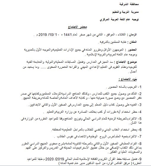 عقد توجيه عام اللغة العربية المركزي بالشرقية اجتماع مع موجهي العموم الأوائل في جميع الادارات لمناقشة امكانية سد العجز في المدارس وتفعيل المسابقات المحلية والدولية، إلي جانب المتابعة الفنية للتوجية ونظام التقويم في التعليم الإعدادي المهني والقراءة المتحررة المحتوي.