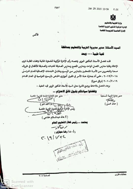 كشف مستند حصل "كشكول علي صورة منه" موافقة وزير التربية والتعليم والتعليك الفني الدكتور طارق شوقي علي إعفاء الطلبة ذوي الإعاقة وطلبة مدارس الفصل الواحد ومدارس المجتمع ومدارس الصديقة للفتيات والصديقة للأطفال في ظروف صعبة والمتحررين من الأمية الملتحقين بالمدارس من الرسوم ومقابل الخدمات الإضافية.