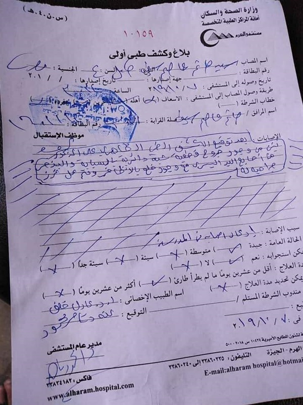 وقالت: "لم اتمكن من تصوير يد أبني وهى مجروحة لأنهم منذ الساعة واحدة ظهرا أخذوه إلى المستشفى ولم يتم ابلاغنا ومبلغناش بأي حاجه ولا حتى بالتليفون، فضل لحد ميعاد التسليم ٣ ساعات ومخبيين عليا لحد الساعة ٣ وانا معرفش عن ابنى حاجه، مشيرة إلى أن المدرسة ترفض إعطائهم أي اشاعات أو تقارير ولا حتى الروشتة.