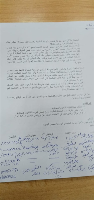 وأكد أولياء الأمور في بلاغهم أنه يتم التعنت بالرفض في إنقاذ طلاب مدرسة السلحدار الرسمية المتميزة خاصة في ظل الضرر الواقع عليهم لضيق المكان ونقص عدد الفصول والمعامل وأماكن مزاولة الأنشطة، والذي يخالف في ذلك الرؤية الاستراتيجية لوزارة التربية والتعليم التي تتيح التعليم والتدريب للجميع بجودة عالية دون تمييز، من خلال توفير بنية أساسية قوية بالمدارس (تشمل المعامل والمكتبات والملاعب والمرافق وخلافه) لتهيئة فرص تعليمية متكافئة لجميع المتعلمين حتى وصل الأمر إلى دمج طلاب الصف الثاني الثانوي بقسميه " علمي و أدبي " داخل فصل واحد وهو الأمر الذي يعد اعتداء صارخا على حق الطالب في تعليم جيد ويتعارض مع فكرة الاستثمار في البشر التي تنتهجها الدولة.