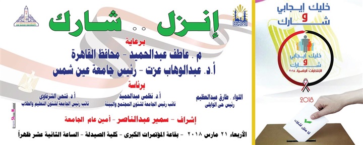 تنظم جامعة عين شمس ندوة بعنوان "انزل.. شارك"، والتي تقام بقاعة المؤتمرات الكبرى للجامعة في تمام الثانية عشر من ظهر غد الأربعاء، تحت رعاية المهندس عاطف عبدالحميد محافظ القاهرة والدكتور عبدالوهاب عزت رئيس جامعة عين شمس.