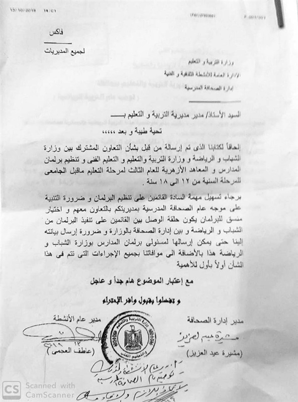 ووجهت وزارة التربية والتعليم "إدارة الصحافة المدرسية" بالتنبيه علي موجه عام الصحافة المدرسية بالمديريات بالتعاون واختيار منسق للبرلمان ليكون حلقة الوصل بين القائمين علي تنفيذ البرلمان من الشباب والرياضة وبين إدارة الصحافة بالوزارة.