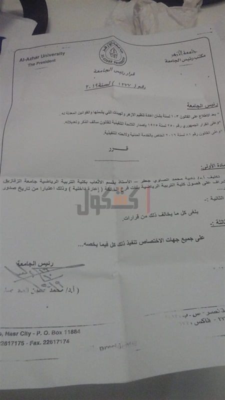 أستاذ بجامعة الزقازيق مشرفاً لـ"تربية رياضية بنات" الأزهر بالقليوبية