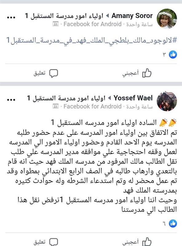 فيما قالت نيفين نبيل ولية أمر طالبة بالمدرسة، لقد علمنا بأن الطالب مالك ياسر تم قبول تحويله من مدرسة الملك فهد لمدرسة المستقبل 1، مؤكدة أنه تم قبول تحويل الطالب، ولا ندري كيف يتم قبوله بمدرسة أبناءنا بعد كل ما حدث منه من وقائع في مدرسته وكيف قبل مدير المدرسة هذا الأمر.