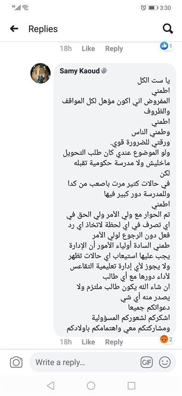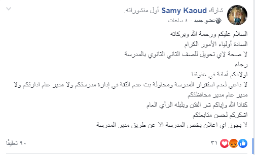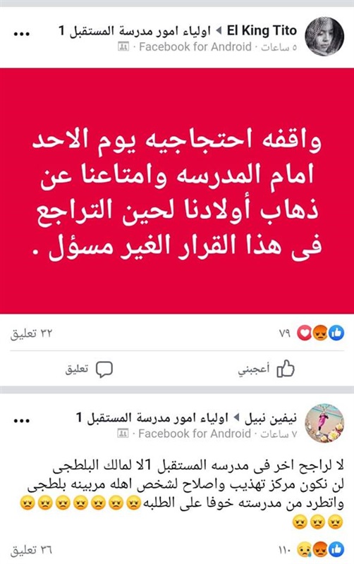 بينما قام مدير المدرسة بنشر بوست على جروب أولياء أمور مدرسة المستقبل 1 ليطمئنهم قائلا: أولياء الأمور الكرام لا صحة لاي تحويل للصف الثاني الثانوي بالمدرسة، رجاء أولادكم أمانة في عنوقنا، ولا داعي لعدم استقرار المدرسة ومحاولة بث عدم الثقة في إدارة مدرستكم ولا مدير عام إدارتكم ولا مدير عام مدير محافظتكم، كفانا الله وإياكم شر الفتن وبلبله الرأي العام، متابعا لا يجوز اي إعلان يخص المدرسة إلا عن طريق مدير المدرسة.