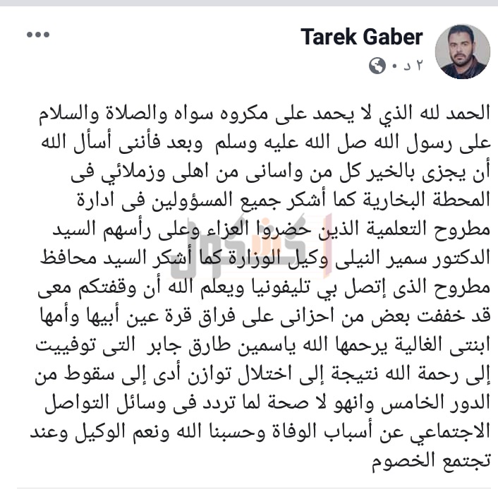 جابر ولي أمر الطالبة ياسمين في منشور عبر صفحته الشخصية علي فيس بوك "الحمد