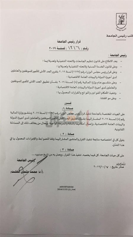 بالبدء فى تطبيق الحد الأدنى على كافة الموظفين والعاملين بالجامعة، وذلك تنفيذاً