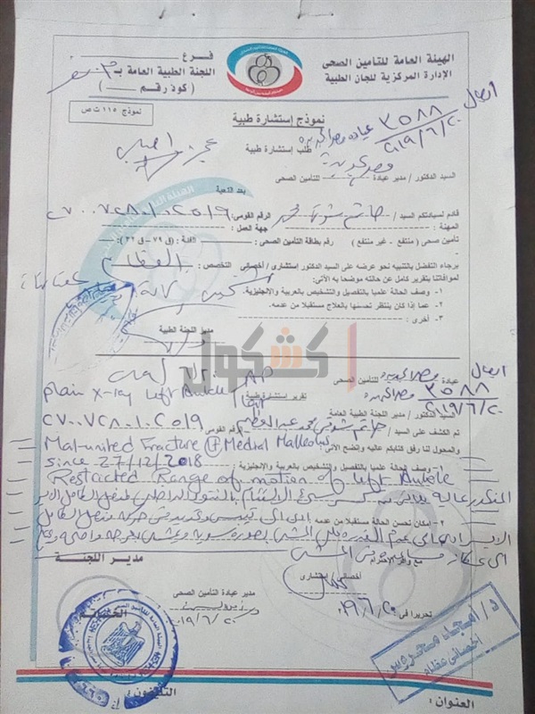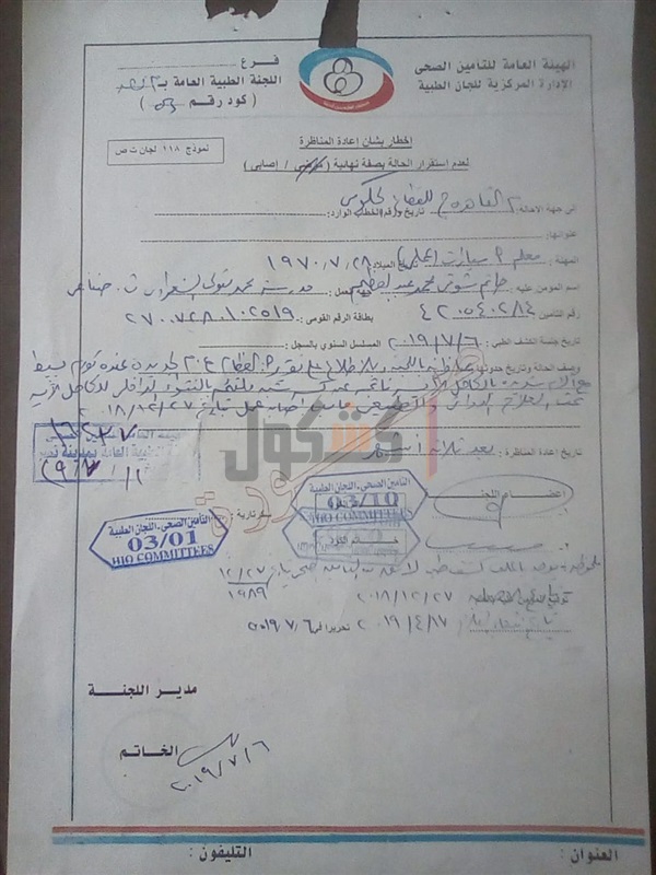 وتابع: إن محل سكني بالزيتون ولا أستطيع أن أذهب إلى التبين فالمسافة تقدر بـ90 كيلو / ذهاب وعودة وأنا مصاب إصابة عمل وأعاني من كسر سىء بمفصل الكاحل أدى إلى تيبس وتحديد فى حركة المفصل، مما أدى إلى عدم القدرة على المشي بصورة سوية، "وبمشى بعرجة واضحة" وأحتاج عكاز مساعد في المشى.