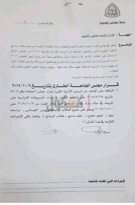 قرر مجلس جامعة الزقازيق, إعفاء الطلاب من الرسوم الإدارية المقررة بقرار رقم (٥٠٦) علي الطالب المتأخر في سداد المصروفات الدراسية حتي تاريخه في حالة سداد جميع المستحق عليه خلال الفترة من ٩/١٠/٢٠١٩ حتي ١٠/١١/٢٠١٩، ويعمم علي جميع الطلاب.