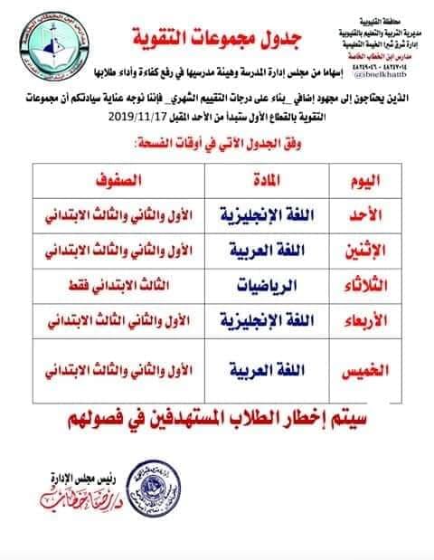 كما خصصت المدرسة يوم الإربعاء لمادة اللغة الإنجليزية للصف الأول والثاني والثالث الإبتدائي، والخميس لمادة اللغة العربية لطلاب نفس الصفوف، لافتة إلي أن المدرسة قسمت مجموعات التقوية إلي عدة قطاعات، القطاع الأول السابق ذكره يبدء الأحد المقبل الموافق 17 نوفمبر الجاري .