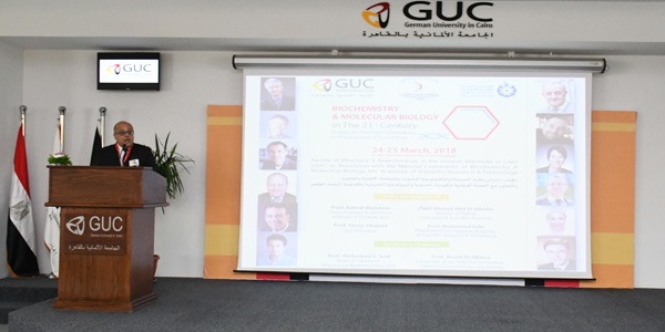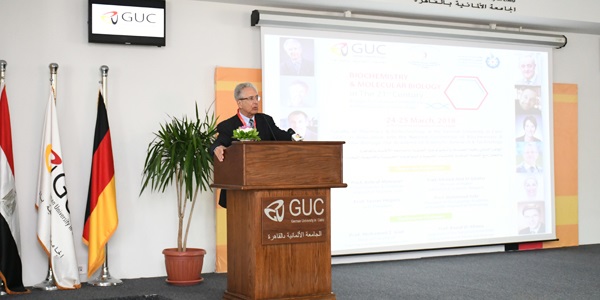افتتحت الجامعة الألمانية بالقاهرة، فعاليات أعمال المؤتمر الدولي للكيمياء الحيوية والبيولوجيا الجزيئية المقام داخل حرم الجامعة، بعنوان "الكيمياء الحيوية والبيولوجيا الجزيئية فى القرن الحادى والعشرين: جسور إلى الطب والتكنولوجيا الدوائية"،الذى تم تنظيمه بشراكة ثنائية بين كلية الصيدلة والتكنولوجيا الحيوية بالجامعة الألمانية بالقاهرة واللجنة الوطنية للكيمياء الحيوية والبيولوجيا الجزيئية بأكاديمية البحث العلمي والتكنولوجيا.