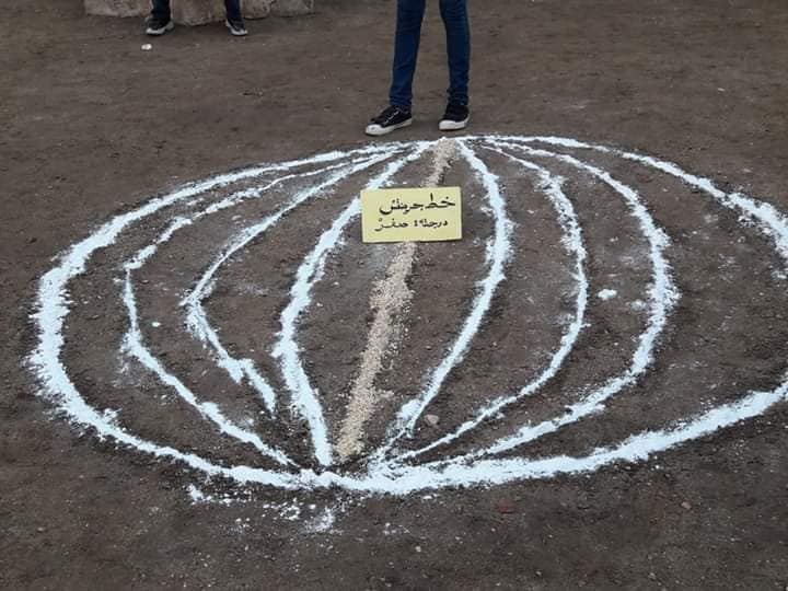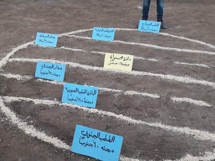 وقامت المعلمة بالنزول بالطلاب لأرض الملعب، لشرح درس "شكل الأرض وأبعادها" بطريقة جديدة ومختلفة، حيث قامت برسم الكرة الأرضية على الأرض مستخدمة بذلك مادة جيرية بيضا، كما أنها قامت بتخطيط الكورة الأرضية وجائت بلوحات صغيرة وكتبت عليها.