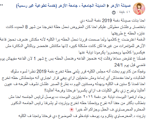 وقال الطالبات:"رجاء ارفعوا البوست نيابة عن دفعة ٢٠١٩ عايزين البوست ده يوصل لرئيس الجامعه احنا مش بنطالب بأكتر من حقنا أنه نفرح ويتعملنا حفله تخرج وياريت لو يشرفنا رئيس الجامعه الدكتور المحترم المحرصاوي ف الحفل وجزاكم الله خيرا"
